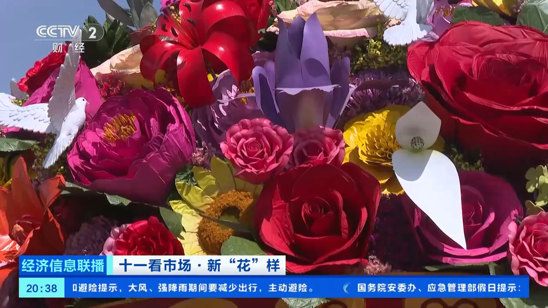 天安门花坛总工程师 张先哲:在天安门广场我们要抗12级风,这些大型的花朵要在大风中岿然不动,依然要保持它良好的面貌,所以我们用的大型仿真花比较多。今年,这些花朵的大小和色彩做得更加精致自如,比如鸢尾花花瓣用了彩绘,让它的细节、纹理、颜色更加逼真。大花篮里的山丹丹、鸽子花,用的雕塑工艺,是用一些不锈钢板敲制出来的。