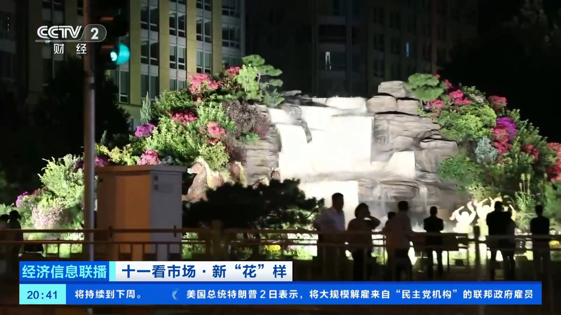 总台央视记者 王闻聪:今年北京天安门广场中心花坛的大花篮和长安街沿线的10组立体花坛,都在国庆中秋假期增添了夜间照明设施,让夜晚的花坛更加引人注目。北京东单东南角的“黄河赞歌”立体花坛,也被称为是“会唱歌的花坛”。在花坛上不仅能看到微观的壶口瀑布、奔腾的骏马、载歌载舞的人群,还有水雾、音乐等声光电技术,更加逼真地还原了黄河之水天上来的气势。晚上八点,这里仍有大量游客前来拍照打卡。